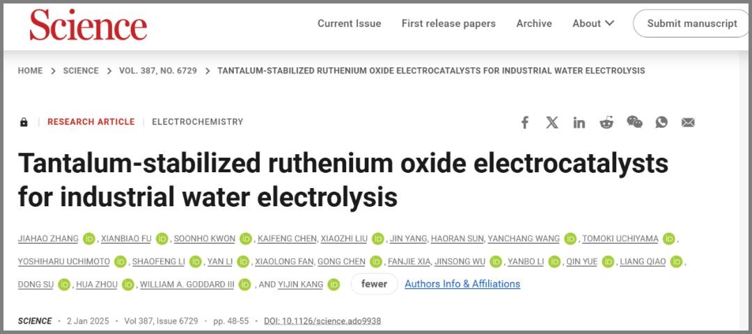 近日,四川大學化學工程學院康毅進教授團隊聯合加州理工學院William A. Goddard教授團隊在《Science》發表了題為“Tantalum-stabilized ruthenium oxide electrocatalystsfor industrial water electrolysis”的文章。