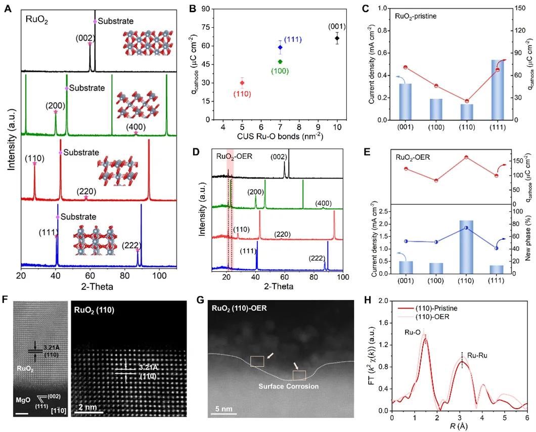 Ru基氧化物因優異的析氧活性被視為另一類潛在的PEM電解水陽極催化劑,然而其穩定性相較于Ir基催化劑表現出明顯劣勢。理解RuO2結構失效機制為指導設計高穩定性RuO2催化劑提供了底層邏輯。當前針對Ru基氧化物的穩定性優化策略已被廣泛報導,但圍繞RuO2的結構失效機制仍未明晰,且常用的納米顆粒催化體系中復雜的表面結構和晶面組成給原子層面研究催化劑失效機制帶來了巨大挑戰。
