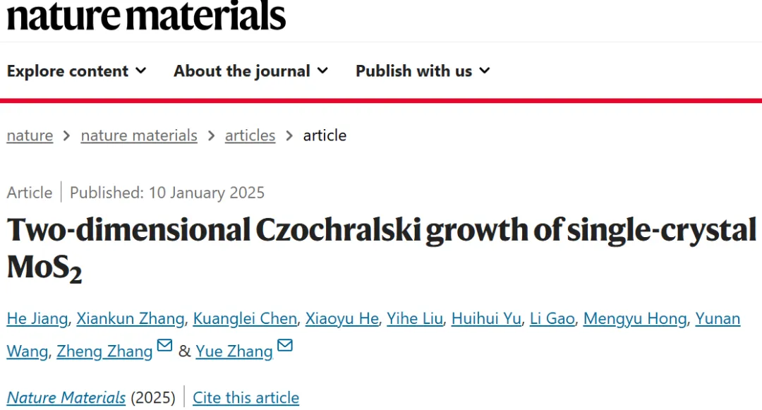 大規模生產高質量的二維過渡金屬二硫族化物(TMDCs)是二維器件工業制造中的一個重大挑戰。張躍院士及張錚教授團隊等人提出了一種名為“二維Czochralski(2DCZ)”的方法,該方法能夠在常壓下快速生長出厘米級尺寸、無晶界的單晶MoS2晶疇,這些MoS2單晶展現出卓越的均勻性和高質量,具有極低的缺陷密度。由MoS2制造的場效應晶體管的統計分析表明,器件良率高,遷移率變化最小。這種2DCZ方法對制造高質量和可擴展的二維半導體材料和器件具有重要意義,為下一代集成電路的制造提供了重要的材料基礎。相關成果以“Two-dimensional Czochralski growth of single-crystal MoS2”為題于2025年1月10日發表在Nature Materials上。第一作者為姜鶴博士。