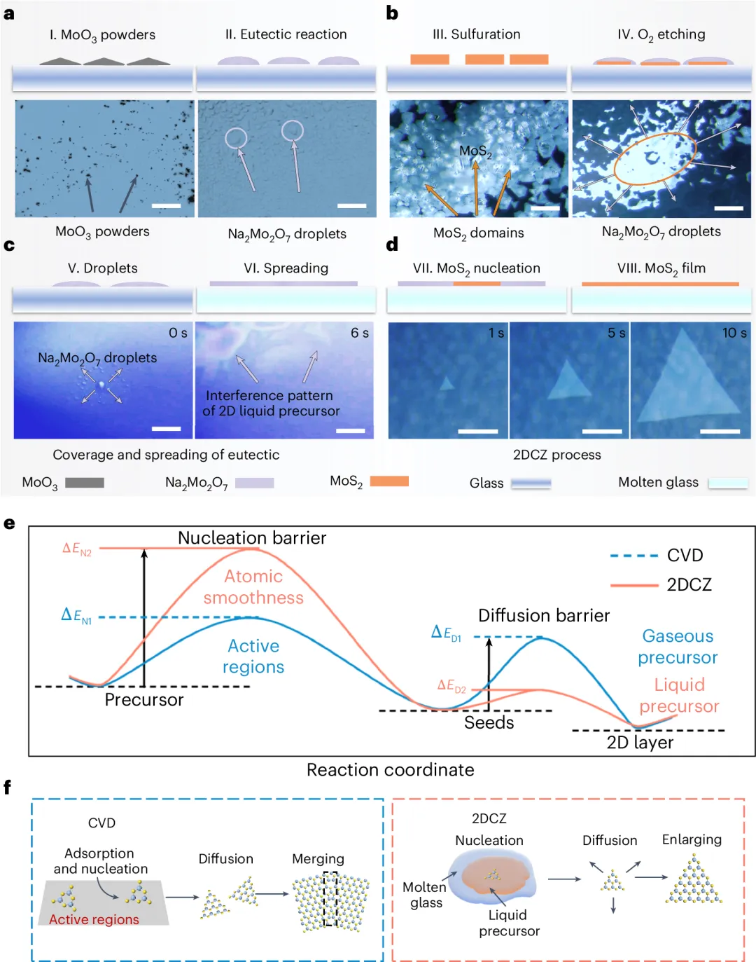2DCZ方法的機理:2DCZ生長過程中引入的液相顯著改變了反應過程。大尺寸的MoS2晶疇是通過抑制成核勢壘和促進擴散勢壘而獲得的。最初,熔融玻璃呈現出原子級光滑和無缺陷的表面,顯著增強了成核勢壘。這降低了生長過程中的形核密度,從而削弱了材料和襯底之間的耦合力。此外,由于液-液體系中熔融玻璃的表面張力較大,液態前驅體容易鋪展,最終在二維液膜與襯底之間形成單獨的界面。預鋪展的前驅體在襯底上的擴散勢壘遠低于通過氣相吸附-擴散-生長的CVD法,這極大地提高了生長速率,達到了75μms-1。因此,超低的成核密度和超快的生長速率相結合,使得MoS2從多晶向單晶轉變,實現了超大尺度的晶界消除