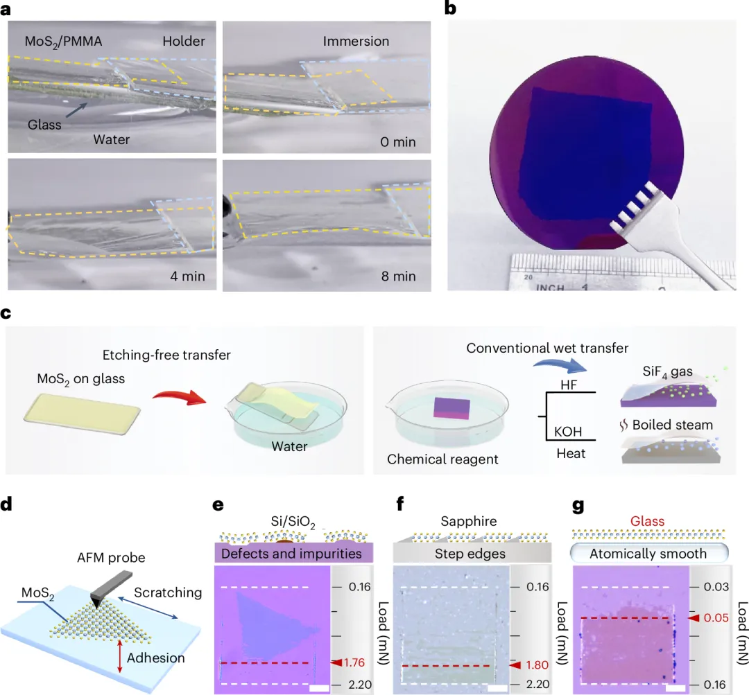 大面積MoS2薄膜的轉移:利用去離子水的表面張力,MoS2薄膜可以自發剝離,無損且高效率地成功大面積轉移到2英寸硅片上。這一方法利用薄膜和襯底見的弱界面耦合特性,無需使用任何蝕刻溶液,從而顯著減少了對化學試劑的依賴,并避免了傳統方法可能帶來的薄膜損傷。MoS2薄膜與襯底之間的附著力越強,薄膜在外力作用下越難以被切開。通過AFM納米劃痕測試量化了MoS2與基材之間的附著力,結果表明2DCZ生長在玻璃基板上的MoS2附著力最弱(0.05mN),顯著低于傳統CVD生長在其他襯底如硅(1.76mN)和藍寶石(1.80mN)。這一溫和高效的轉移方法為大面積單層二維半導體材料的完整轉移提供了新思路,有望促進其在集成中的應用。
