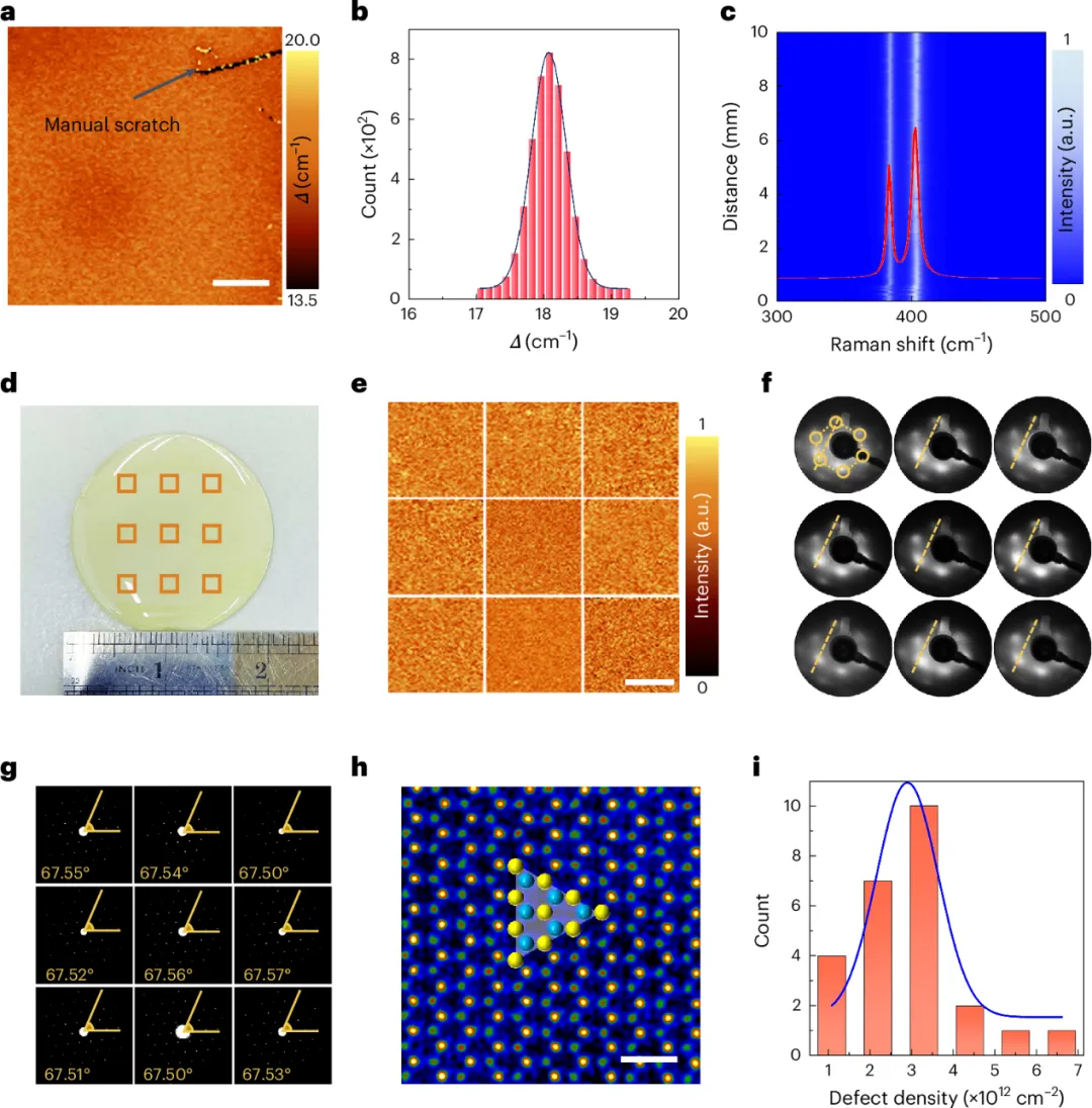 MoS2的均一性和結晶度:拉曼測試表明,2.5×2.5mm2區域內的峰值差異極小(平均值為 18.22cm-1),低于傳統CVD方法,表明缺陷密度較低。低能電子衍射進一步證實了薄膜在厘米尺度的單晶特性。掃描隧道顯微鏡的原子分辨率圖像顯示MoS2薄膜具有一致的六方晶格結構,通過統計得到的硫空位缺陷密度僅為2.9×1012cm-2。此外,水輔助低無損轉移過程進一步提升了薄膜的整體質量。與CVD相比,2DCZ的液-固結晶過程顯著增強了溶質擴散效率,確保了大面積單層MoS2的均勻性和高結晶度,使其適合應用于大規模集成電路制造。