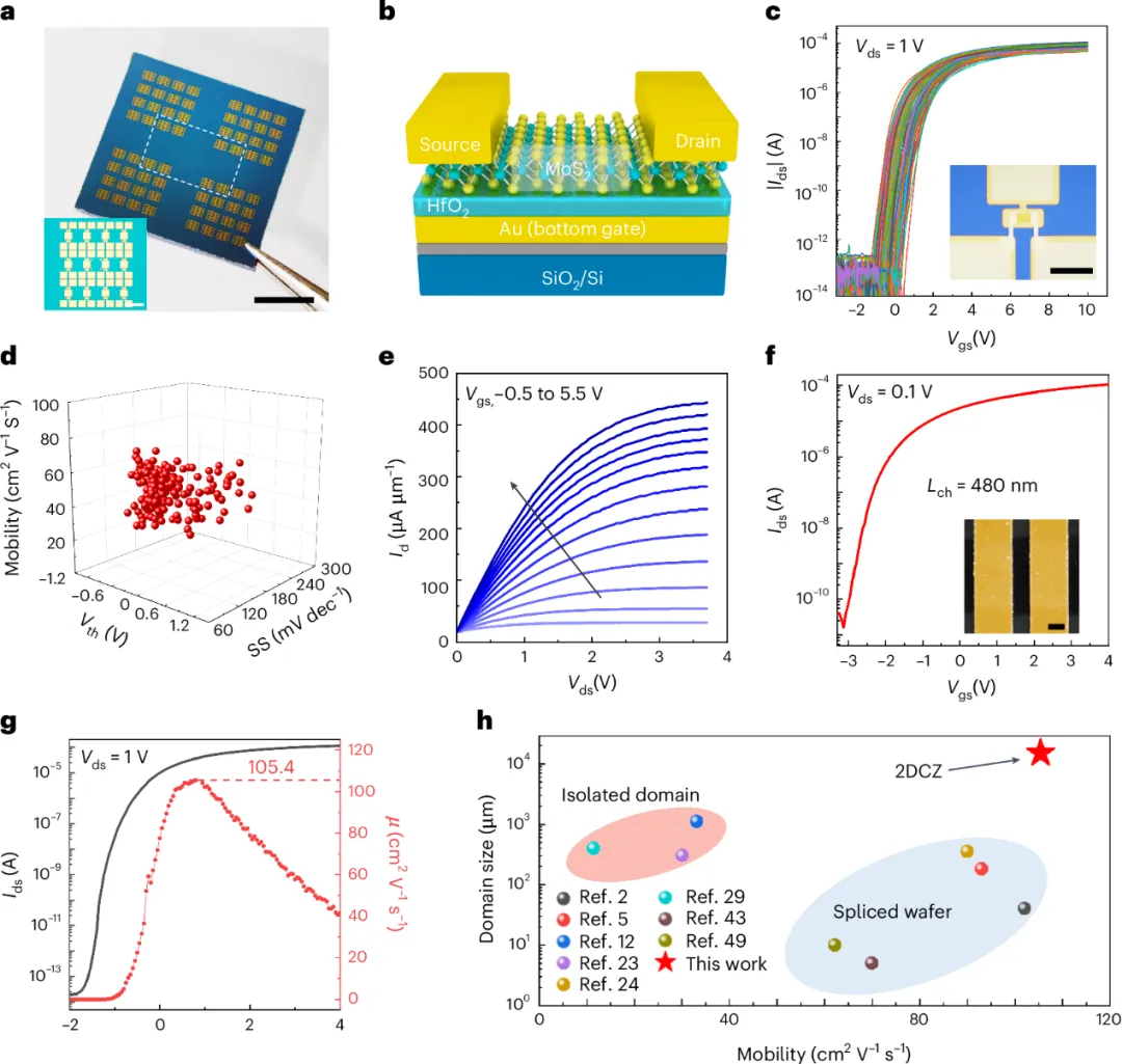 該項工作開發的2DCZ方法為生長具有厘米尺度晶疇的高均一性和高質量的晶圓級MoS2提供了新的途徑,有望推動傳統二維半導體材料生長方法的創新。與傳統的Czochralski過程相比,2DCZ方法通過在熔融玻璃上實現二維液態前驅體,抑制了垂直結晶,促進了橫向面內結晶。此外,還對熔融前驅體中MoS2的超快結晶過程(75μms-1)進行了原位表征,揭示了2DCZ機制。與傳統CVD法相比,該方法大大提高了MoS2生長的質量、規模和效率。2DCZ方法與硅基制造工藝兼容,為二維TMDCs的發展提供了理論指導,為二維半導體材料的工業化應用提供了可能。