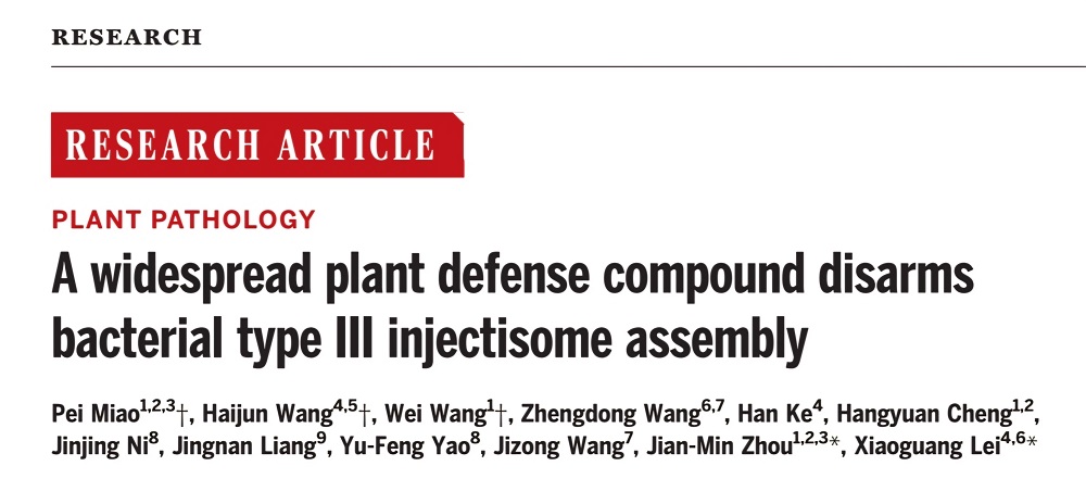 2025年2月28日,北京大學化學與分子工程學院/北大-清華生命科學聯合中心雷曉光教授團隊聯合中國科學院遺傳發育所/崖州灣國家實驗室周儉民研究員團隊在Science上發表了題為“A widespread plant defense compound disarms bacterial type III injectisome assembly”的研究論文(Science 2025, 387, eads0377),首次揭示了一類植物內源存在的、具有作用機制獨特、廣譜抗菌活性的天然產物分子——芥酸酰胺。研究表明,芥酸酰胺通過特異性破壞植物病原細菌的三型分泌系統(T3SS)組裝,有效抑制其致病力,從而實現對多種細菌侵染的廣譜抑制作用。這一機制體現了“不戰而屈人之兵”的創新抗菌策略,與傳統抗生素藥物相比具有顯著優勢:芥酸酰胺不直接殺滅細菌,而是選擇性地降低病原菌的致病力,這種獨特的作用模式不僅確保了更高的生物安全性,還顯著減少了對環境的污染風險,同時有效規避了細菌耐藥性的產生。這一重大科學發現為新型生物農藥的研發開辟了全新路徑,對推動綠色農業可持續發展具有重要的理論和實踐意義。