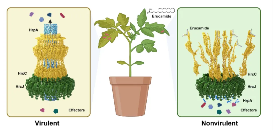 研究發現,芥酸酰胺能夠靶向破壞病原細菌的關鍵致病裝置——三型分泌系統(Type III secretion system, T3SS)。T3SS是許多動植物病原細菌用于向宿主細胞分泌毒性效應蛋白的核心裝置,對細菌致病性至關重要。通過遺傳學實驗,研究團隊證實芥酸酰胺的積累是植物實現對病原細菌免疫的關鍵機制。進一步的研究揭示,芥酸酰胺與T3SS的重要組分HrcC蛋白特異性結合,干擾其在病原細菌外膜上的正確定位,從而有效抑制T3SS的組裝,使病原細菌失去致病能力。