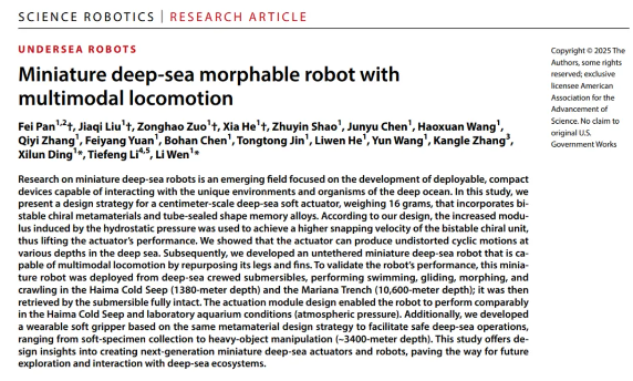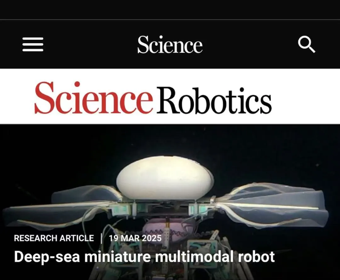 這一能在萬米深海實現多模態運動的小型深海可變形機器人,由北京航空航天大學機械工程及自動化學院研究團隊聯合中科院深海所、浙江大學歷經6年共同研發,深海小型多模態機器人研究成果于3月20日發表在國際學術頂刊《科學·機器人》(Science Robotics),為深海探索帶來了更多可能性,成果同時被Science Robotics官網首頁大圖介紹。